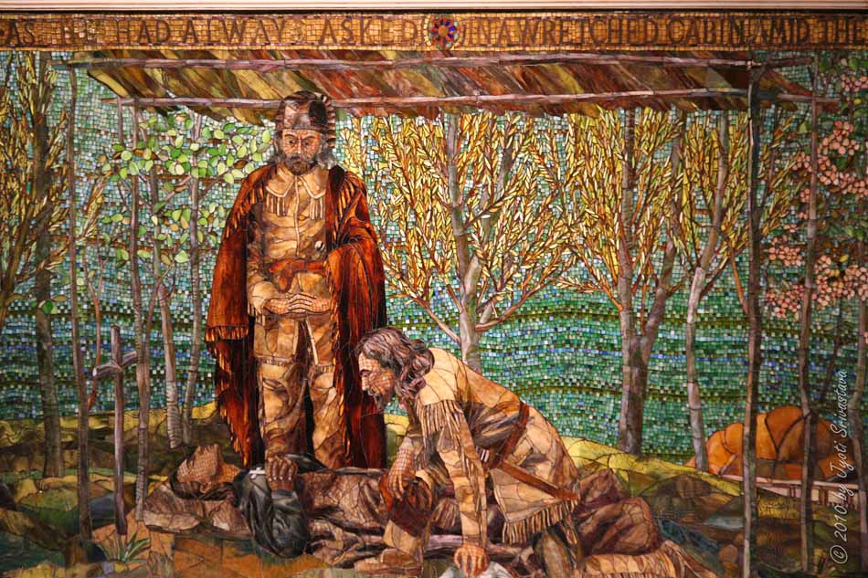 “In this memorial rotunda, which is considered the most artistic and interesting portions of the building, [are]...three pictorial tablets descriptive of the events in the life of Marquette. These glass mosaic panels are certainly works of high artistic value.. a glowing series of pictures never before attempted in glass mosaic.”